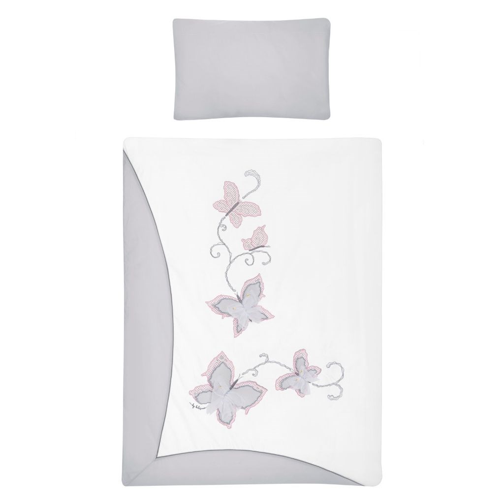 Frumoasa şi delicata şedinţă de 5 piese de pat din bumbac, Belisima Butterfly, pentru bebeluşi. Este fabricată dintr-un material moale şi plăcut la atingere. Setul include o cămaşă de pernă de aproximativ 40x60 cm, o cămaşă pentru pilote de aproximativ 100x135 cm, o protecţie de margine de aproximativ 180 cm, umplutura pentru pernă şi pilota. Materialul este 100% bumbac.