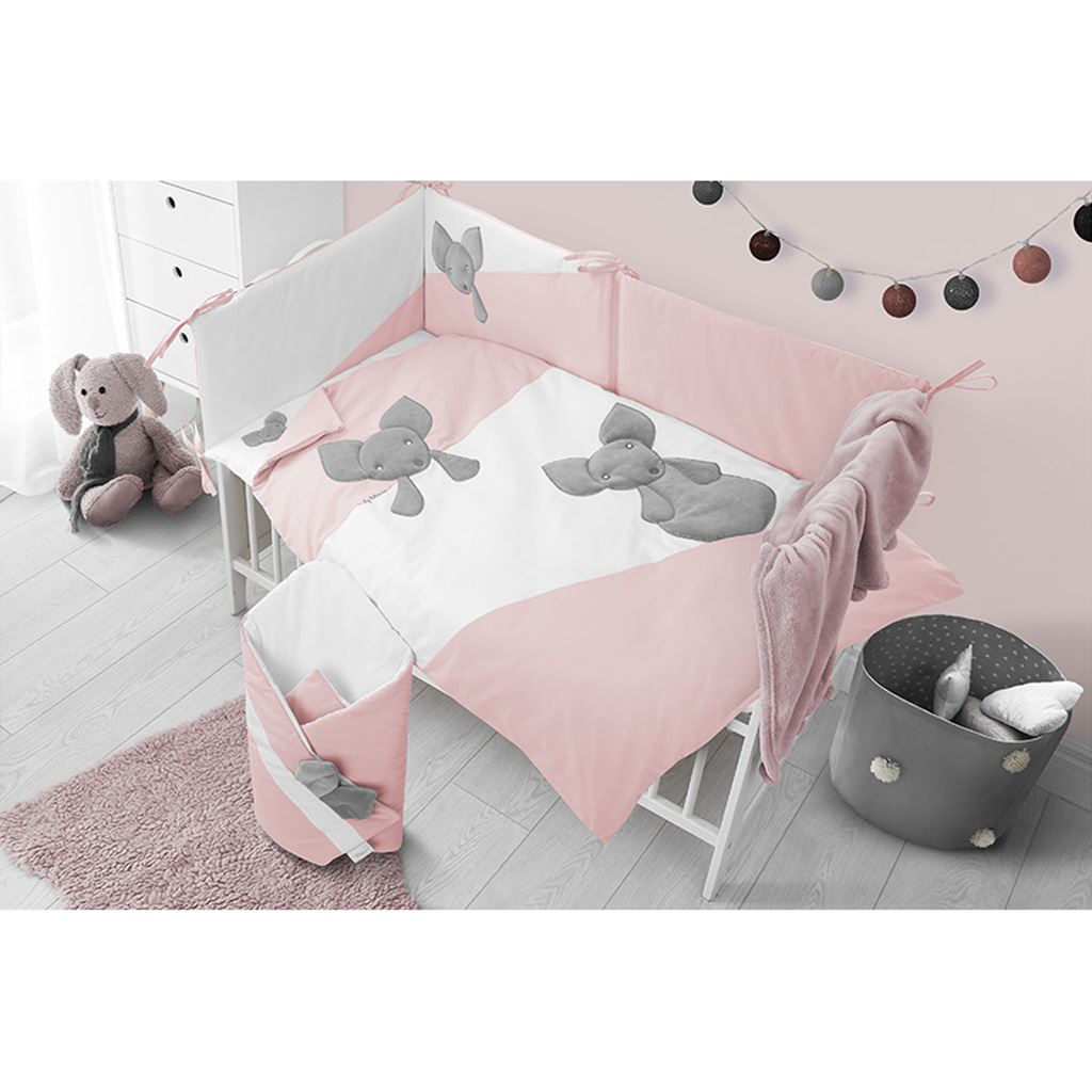 Frumoasa set 5 piese din bumbac pentru patutul copiilor - Belisima Mouse pentru bebeluşi. Setul este decorat cu un frumos motiv de şoareci. Este fabricat dintr-un material moale şi plăcut la atingere. Setul include lenjeria pentru pernă de aproximativ 40x60 cm, lenjeria pentru pilota de aproximativ 100x135 cm, balustrada de aproximativ 180 cm, umplutura pentru pernă şi pilota. Materialul este 100% bumbac.