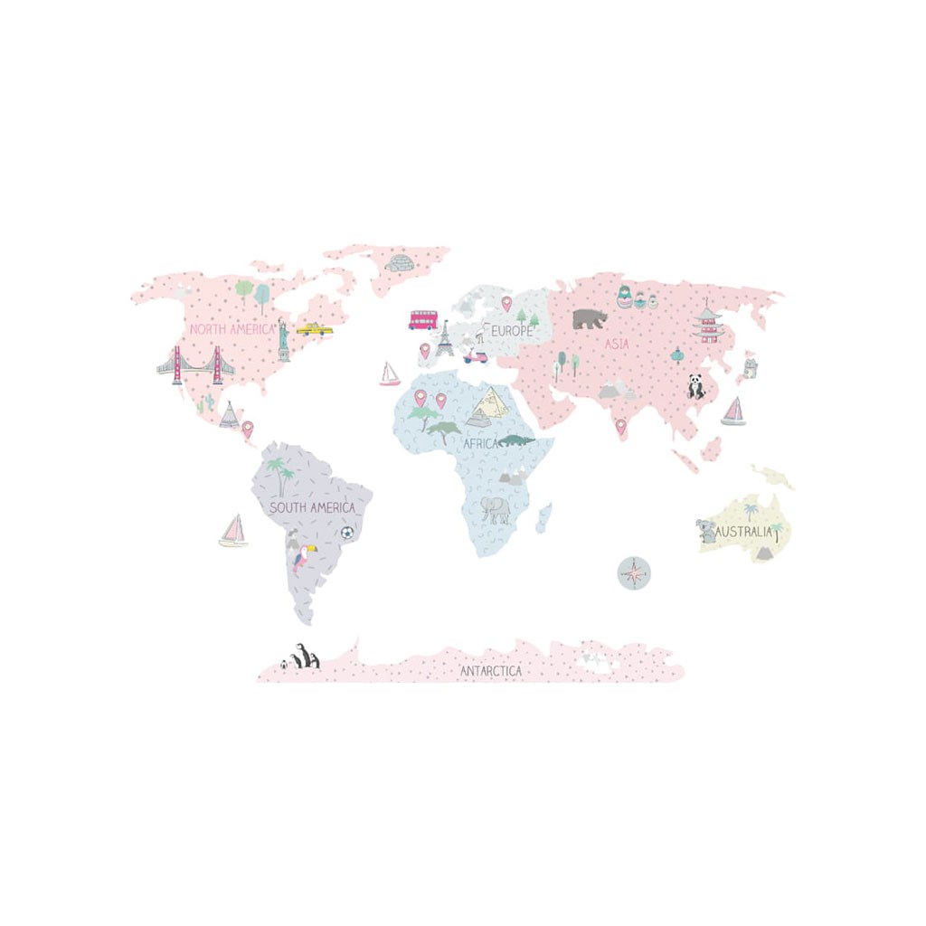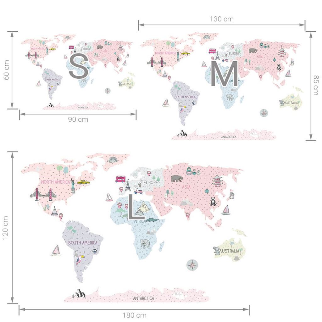 continente, insule şi elemente suplimentare (educative) M (130x85 cm). Dimensiunile exacte ale fiecărei părţi a autocolantului sunt prezentate în ultima fotografie. Atenţie: Nu recomandăm aplicarea autocolantelor noastre pe pereţi vopsiţi cu vopsele latex, netede sau ceară. împachetate în tuburi ecologice.
