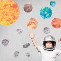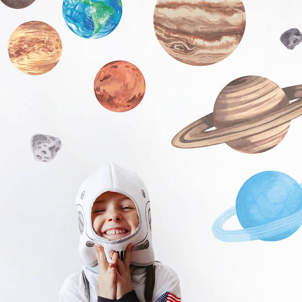Autocolant frumos pe perete cu sistemul solar S. Autocolantele cu sistemul solar sunt un mod minunat de a adăuga în camera copilului un motiv spaţial extraterestru. Setul de autocolante include 8 planete: Mercur, Venus, Pământ, Marte, Jupiter, Saturn, Uranus şi Neptun. Setul include, de asemenea, soarele, luna şi câteva asteroizi.