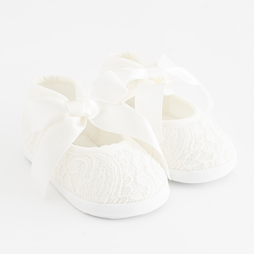 Botosei pentru nou-născuţi New Baby. Aceste botosei frumoşi sunt în stilul sandalelor de fată, cu un aspect modern de legare. Botoseii sunt confortabili pe picior şi au un interior larg, ceea ce permite mişcarea liberă a degetelor şi a muşchilor. Produsul nu este destinat mersului pe jos. Sunt foarte uşori, cu o talpă subţire şi sintetică. Compoziţie: dantelă: 100% poliester. Tălpa: material sintetic PVC fără BPA. Lungimea interiorului talpii este de 10 cm. Potrivit pentru copii de la 0-3 luni. Livrat într-o cutie convenabilă. Atenţie: sub căptuşeală textilă se găseşte uneori un strat de hârtie, care menţine forma botoseiilor. îndepărtaţi acest strat de hârtie înainte de prima utilizare.