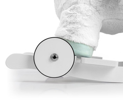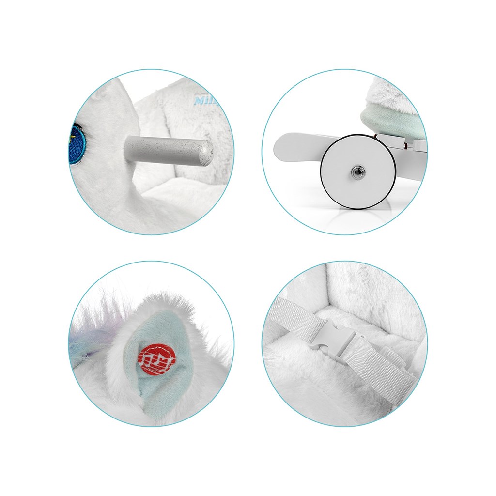 Calul are patine din lemn cu suporturi pentru picioare și mânere care ajută la menținerea echilibrului în timpul jocului, precum și un set de roți pliabile, datorită cărora se transformă în câteva secunde într-un minunat vehicul de pluș.