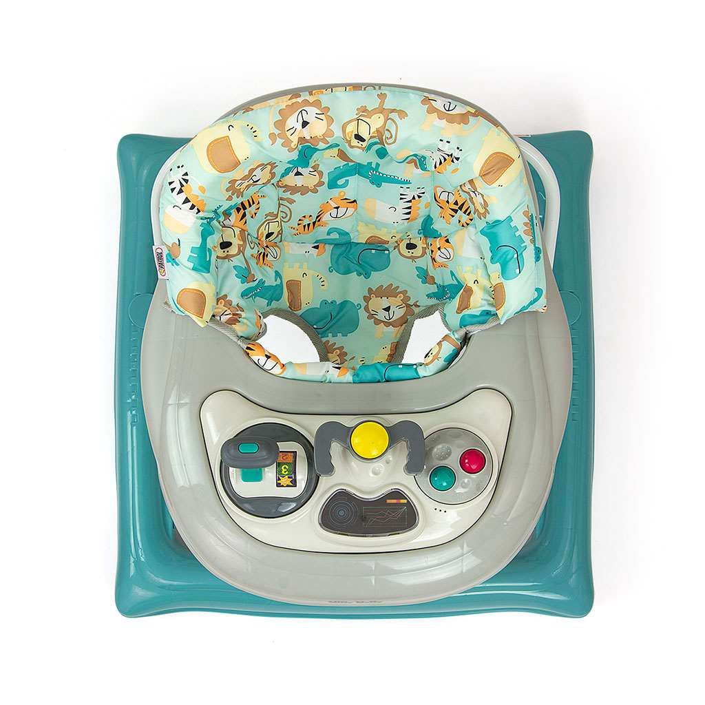 Cele patru roţi pivotante de înaltă calitate, care nu zgârie suprafaţa pe care se deplasează, asigură libertatea de mişcare şi cele opt opritoare de cauciuc protejează copilul de alunecare pe scări sau alte obstacole.