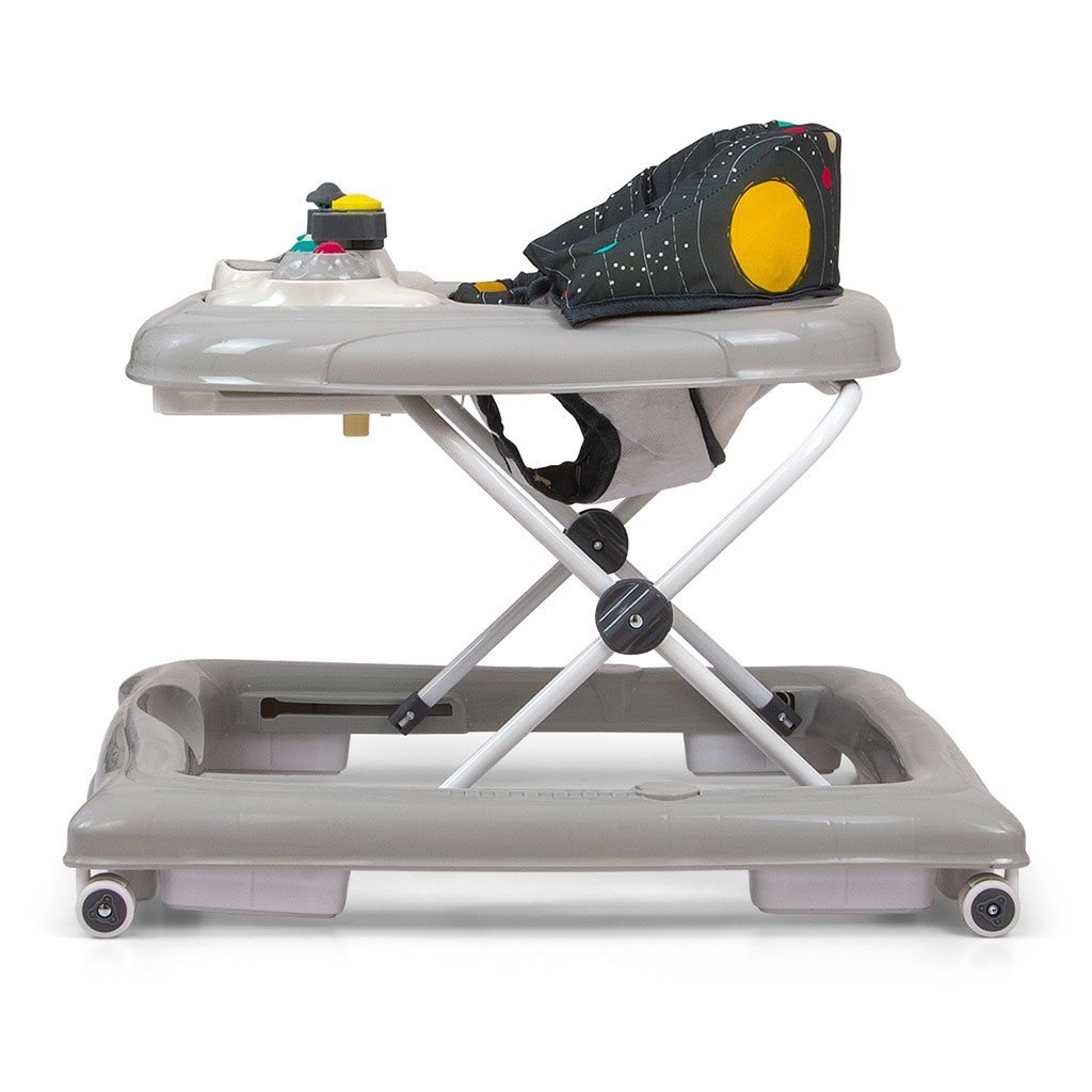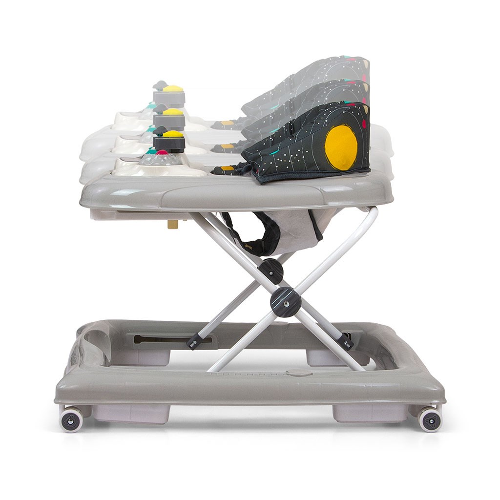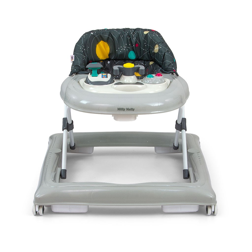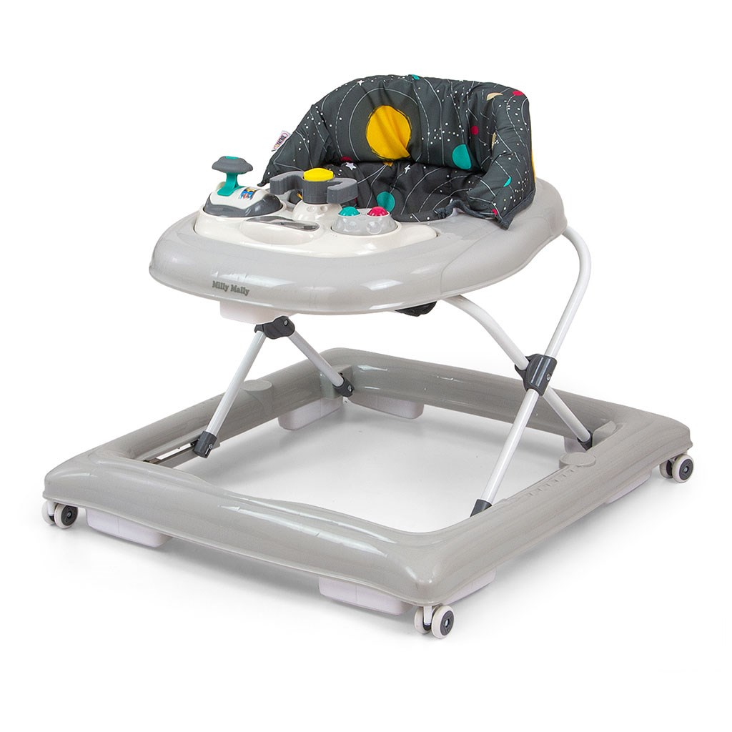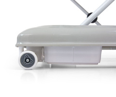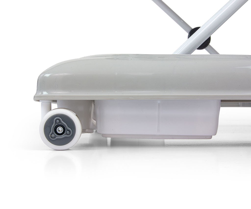 Cele patru roţi pivotante de înaltă calitate, care nu zgârie suprafaţa pe care se deplasează, asigură libertatea de mişcare şi cele opt opritoare de cauciuc protejează copilul de alunecare pe scări sau alte obstacole.