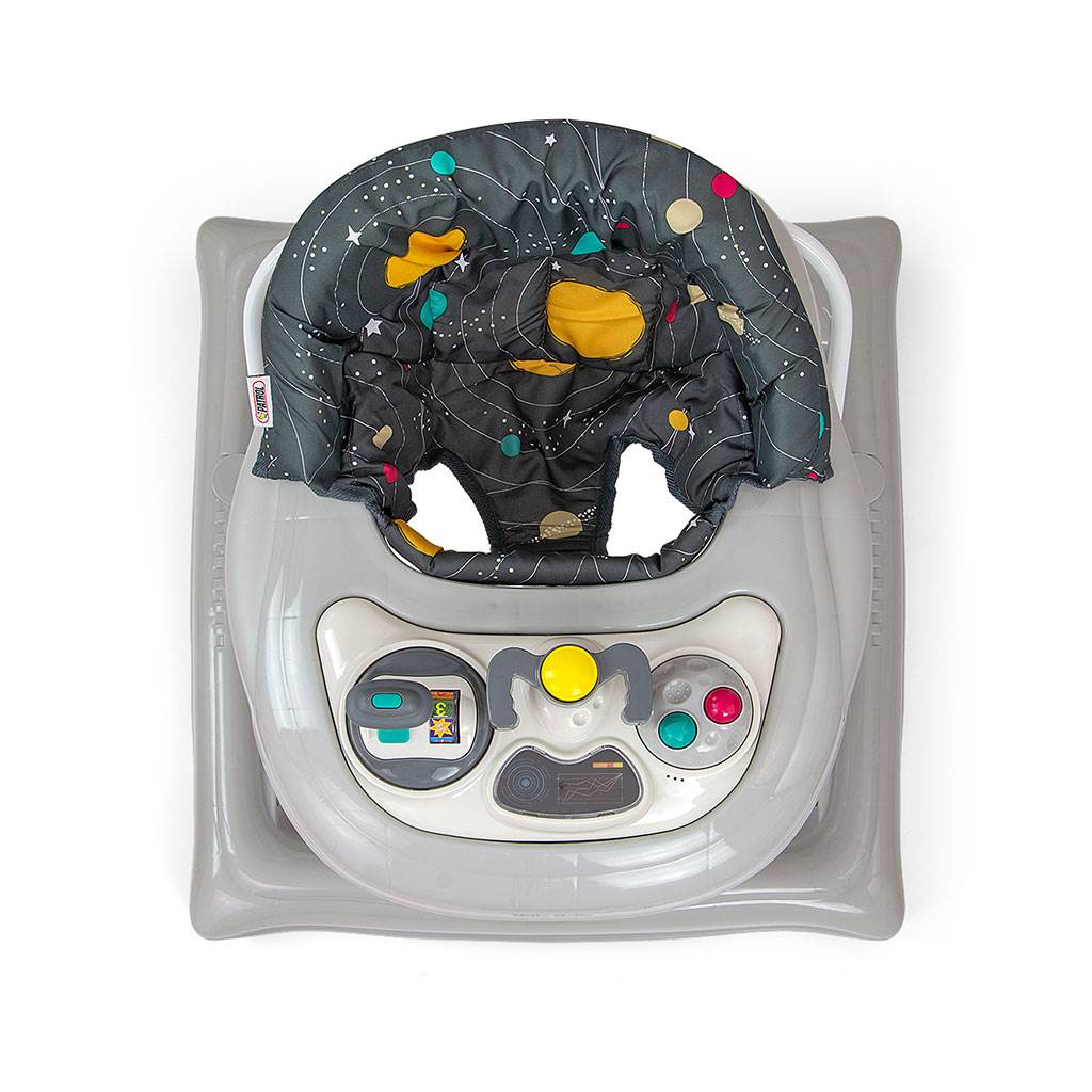 Produsul are un panou educativ care conţine o serie de surprize aşteptând mici exploratori: lumini, fluierat, melodii, jucării zornăitoare, butoane şi alte elemente mobile. După îndepărtarea panoului din tava chodítka, va servi ca un jucărie independentă, de exemplu ca un companion de călătorie, iar placa va servi ca o masă de joc.