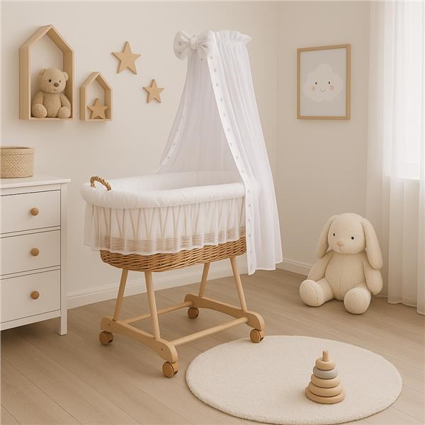 Acest coş frumos, mare, ţesut din nuiele cu un cadru original din lemn este o soluţie excelentă pentru apartamentele şi casele mici. Roţile sale pivotante facilitează mutarea coşului, astfel încât să puteţi avea mereu copilul alături de dvs. Coşul este suficient de mare, astfel încât copilul să poată dormi liniştit - nu doar acasă, ci şi afară în grădină sau pe balcon.