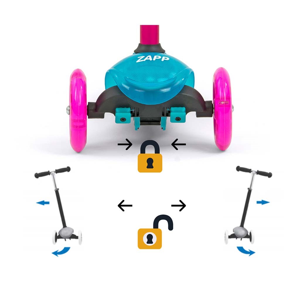 Pentru a satisface nevoile micilor noştri sportivi, am creat trotineta ZAPP. Este soluţia ideală pentru copiii activi care iubesc mişcarea. Zapp este fabricat din materiale de înaltă calitate şi este perfect pentru plimbări sau pentru distracţie în jurul casei. Construcţia metalică garantează durabilitatea produsului. Trotineta are, de asemenea, frână şi aripă pe roata din spate. Direcţionarea şi virajele se fac pe baza schimbării echilibrului corpului. Un mare avantaj al trotinetei sunt cele 3 roţi, care asigură stabilitate şi siguranţă. Copiii se vor bucura şi de roţile din faţă care luminează în timpul deplasării.