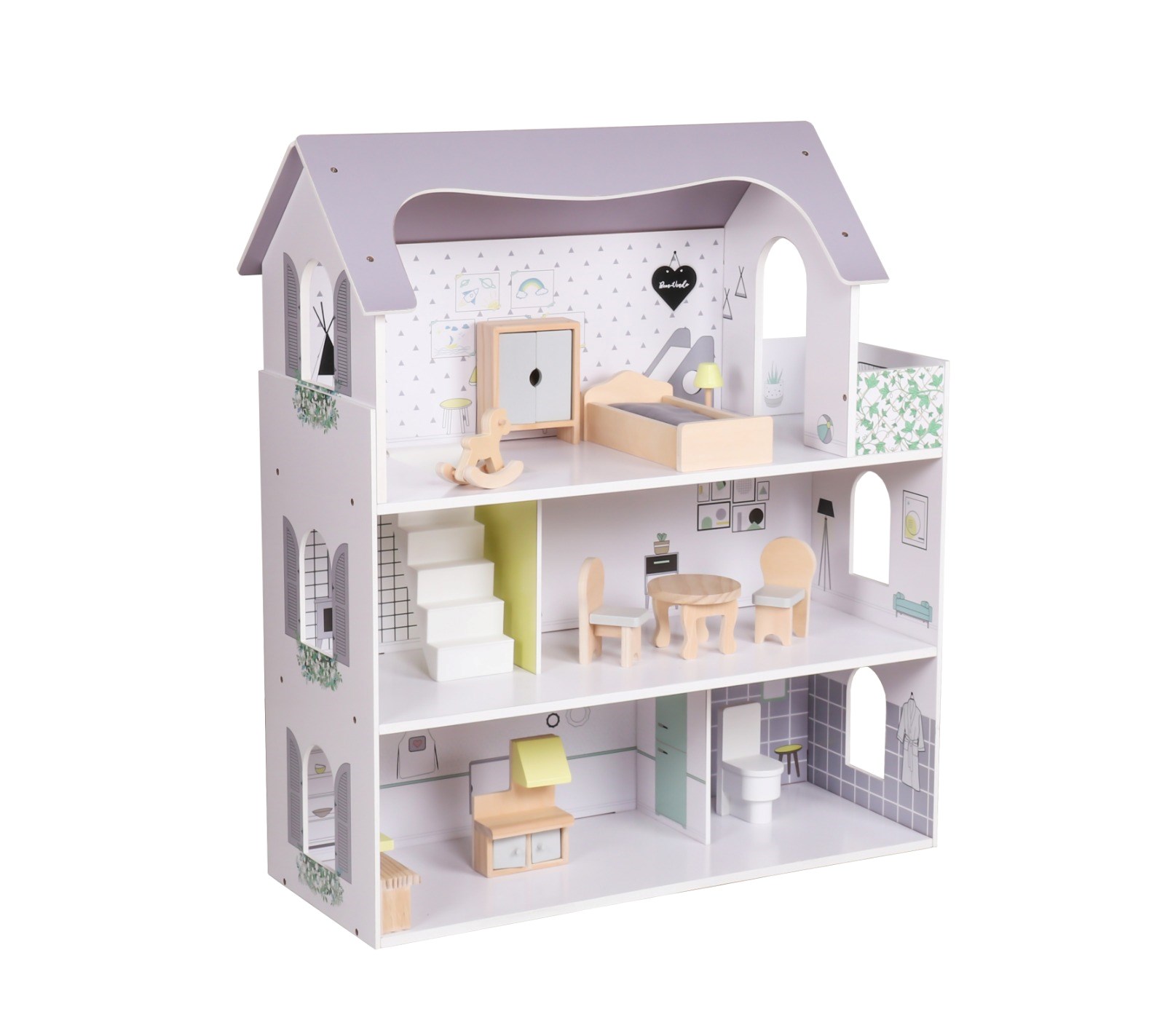 Include 10 piese de mobilier care susțin jocul creativ și aranjamentele flexibile. Detalii realiste și construcția deschisă permit accesul ușor în toate camerele. Materiale de calitate – lemn masiv + MDF garantează durabilitate, stabilitate și siguranță. Designul Montessori susține independența, coordonarea motorie fină și dezvoltarea abilităților sociale. Ideal pentru joaca cu păpuși sau figurine de diferite dimensiuni.