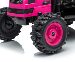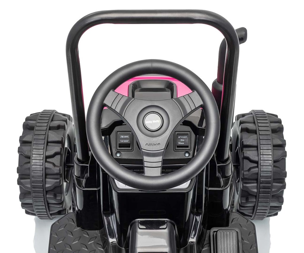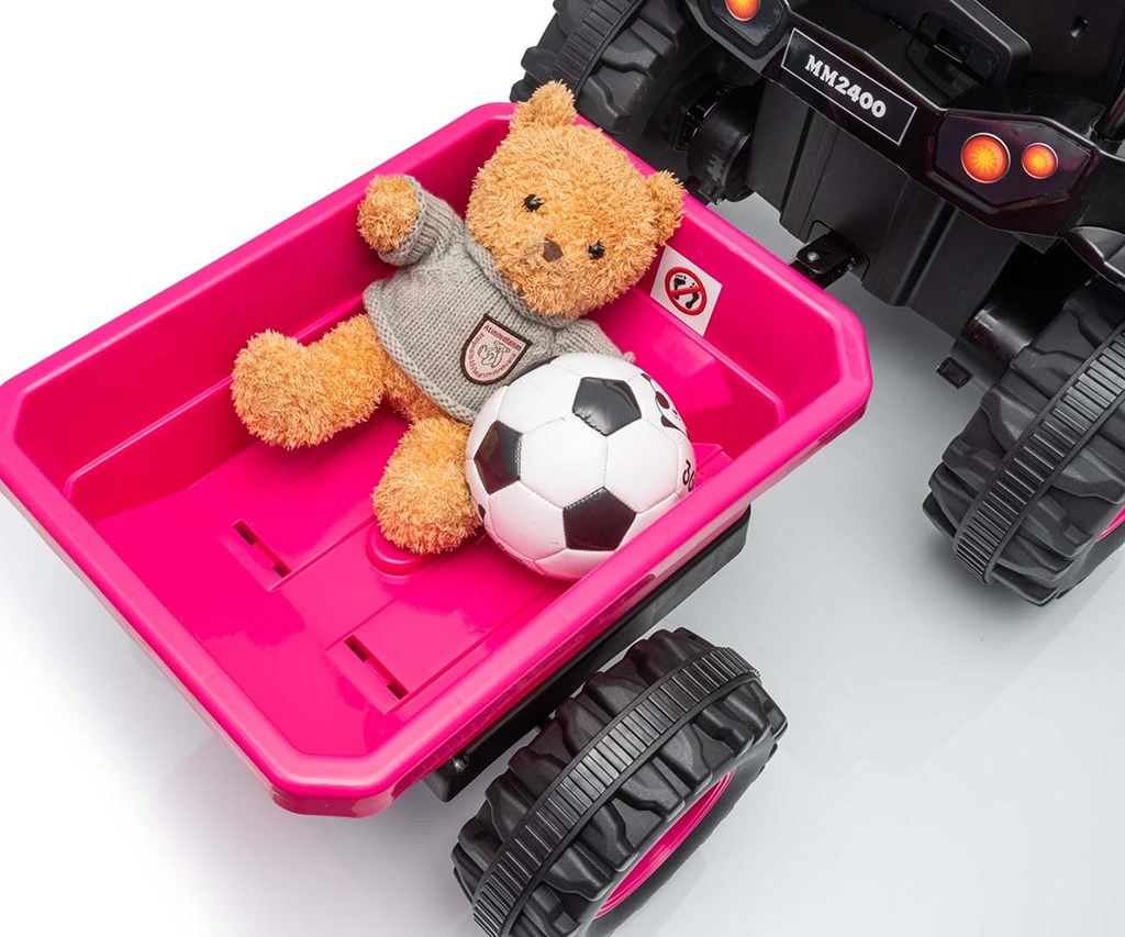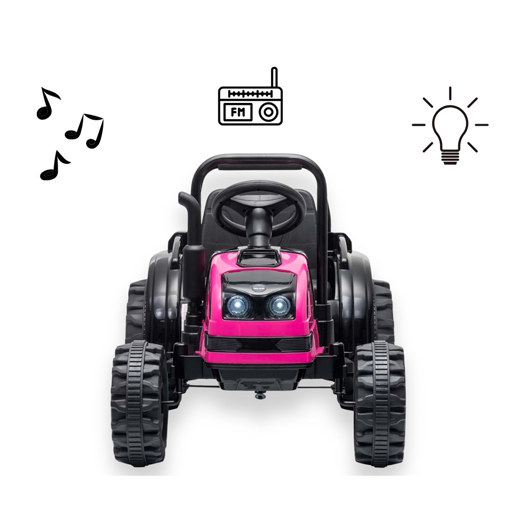 Acesta este vehiculul ideal pentru copiii cu vârste cuprinse între 3 și 5 ani. Tractorul vine cu o remorcă pentru un plus de distracție. Barele de siguranță metalice în față și în spate, precum și imitația coșului de fum / evacuare, sunetul răgușit al motorului tractorului, toate acestea permit micilor șoferi să își dezvăluie imaginația și să se simtă ca adevărați agricultori. Comutatorul activează sunetul realist al motorului tractorului, în timp ce butonul oprește vehiculul simultan. Cele două motoare amplasate în tractor ajung la o viteză medie de 3-5 km/h.