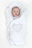O minunată înfăşătoare de lux, moi şi moale, cu şireturi de la Minky New Baby. învelitoarea este realizată din două tipuri de ţesături şi este decorată cu o inimă brodată superbă şi o alunecare cu puncte de bumbac gri. Prima este o ţesătură Minky foarte moale şi plăcută la atingere, cu umflături pentru stimularea senzomotorică şi a doua este 100% bumbac. Este ideală atât pentru bebeluşi de la naştere, cât şi pentru copii mai mari ca pătură de joacă, pentru cărucioare sau pentru exterior. Este realizată dintr-un material de foarte bună calitate, care nu lasă culoarea să se estompeze şi nu provoacă reacţii alergice. învelitoarea se leagă cu trei rânduri de panglici, înfăşurând strâns bebeluşul. Bebeluşul se va simţi confortabil şi în siguranţă în această învelitoare.