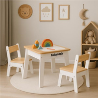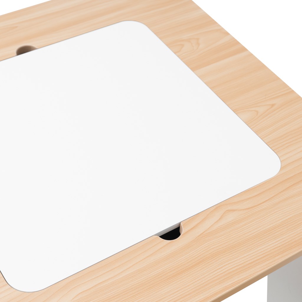 Setul include o masă cu două scaune fabricate dintr-un material rezistent, care asigură stabilitate și durabilitate. Masa este echipată cu un blat detașabil practic – sub acesta se află un spațiu de depozitare unde se pot ascunde cu ușurință creioanele, hârtia, jucăriile mici sau construcțiile. Astfel, copiii au tot ce le trebuie la îndemână și mențin ordine.