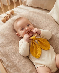 Zgarda cu batista din mușelin este setul ideal când bebelușului îi ies dinții. Zgarda este fabricată din lemn de fag prietenos cu mediul și dintr-un material moale din mușelin. Complet sigur pentru copii, aduce o ușurare liniștitoare în timpul erupției dentare. Zgarda poate fi folosită și ca jucărie pentru bebeluși. Zgarda se potrivește perfect cu celelalte produse noastre din mușelin, creând astfel un set frumos, ideal pentru a fi cadou la o petrecere pentru copii.