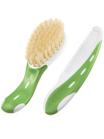 Periuţă şi pieptene Nuk. Periuţă de păr din fire naturale fine cu pieptene. Periuţa masează uşor scalpul bebeluşului, contribuind astfel la circulaţia sângelui în scalp, la întărirea şi aranjarea firelor de păr. Pieptenele are marginile rotunjite, ceea ce face mai uşoară îngrijirea copilului. Mânerul antiderapant asigură o prindere confortabilă a periuţei şi a pieptenului. Potrivit pentru copii de la naştere.