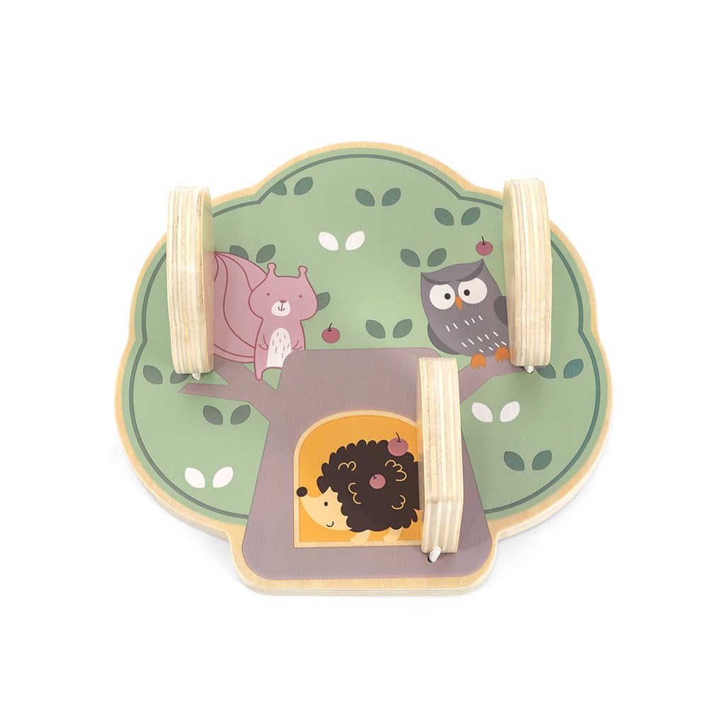 Vă prezentăm o placă de manipulare din lemn în formă de copac, care dezvoltă excelent simţul şi gândirea logică a copiilor. Pe placa de lemn sunt 3 uşi şi în spatele fiecărei uşi se află o altă creatură: veveriţă, bufniţă şi arici, care poartă mere pe spate.