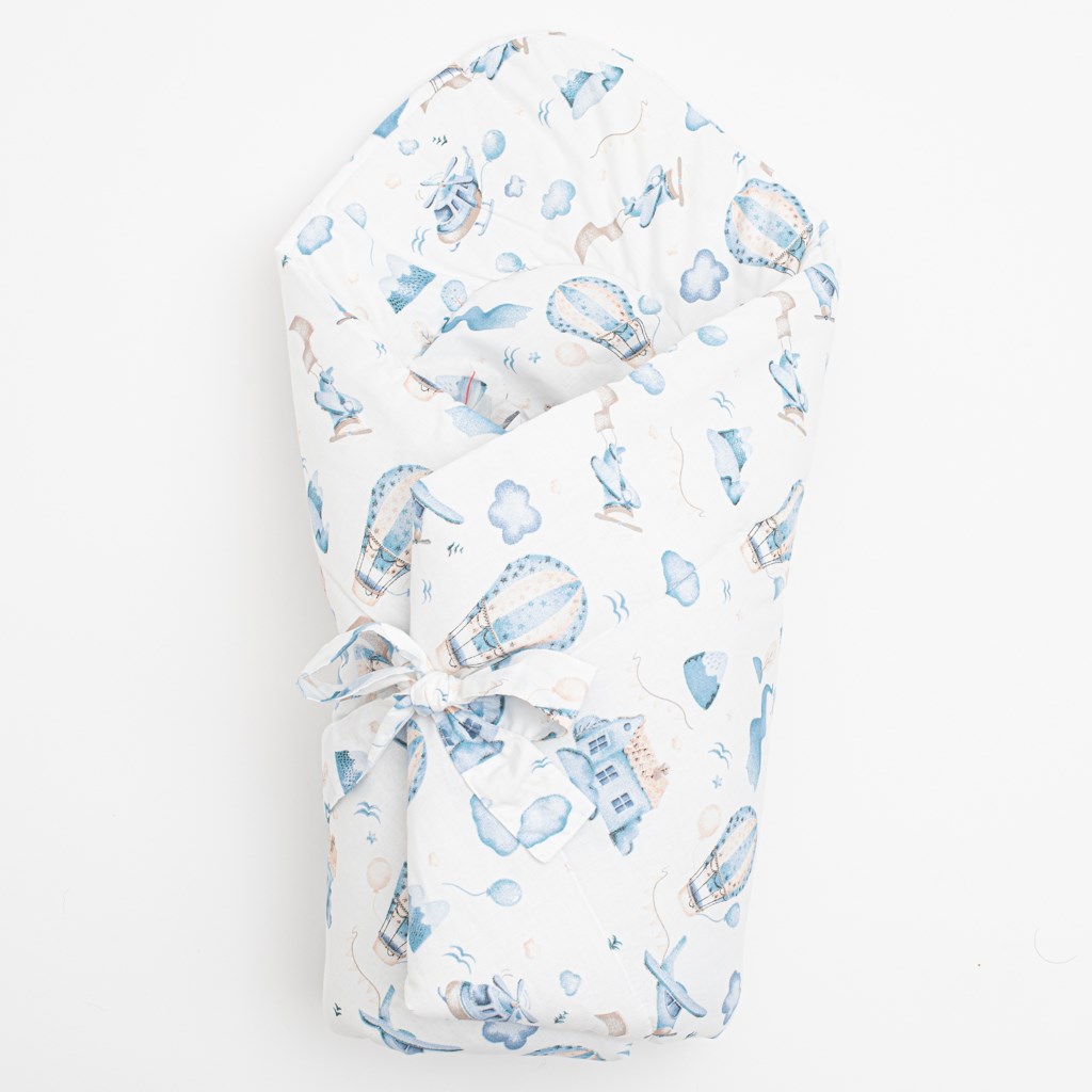 Frumos înfăşător pentru copii New Baby Romance pentru bebeluşi. învelişul este fabricat din materiale de calitate şi moi care asigură căldura plăcută pentru bebeluşul dumneavoastră. învelişul este decorat cu un print de basm aventuros printre nori. Se leagă cu şnur. Dimensiuni aproximative 75x75 cm. Compoziţie: acoperire 100% bumbac, umplutură 100% poliester. />Aceste produse sunt sigure deoarece: