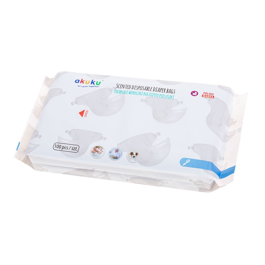 Setul de saci de unică folosinţă parfumaţi va asigura eliminarea igienică a scutecelor, batistelor sau şerveţelelor folosite. Acest ajutor practic ar trebui să nu lipsească de pe niciun blat de schimbat scutece, din nicio geantă sau cărucior în timpul plimbării. Acestea sunt suficient de mari pentru toate dimensiunile de scutece. Ambalajul este prevăzut cu un închizător simplu şi conţine 100 de saci.