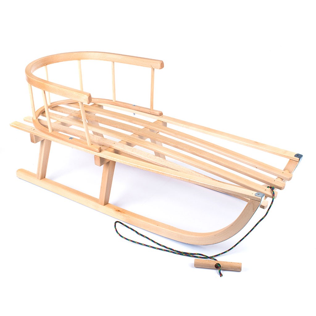 Săniuşe din lemn pentru copii cu spătar şi frânghie din lemn de fag de înaltă calitate (lemn tare rezistent la deteriorare).