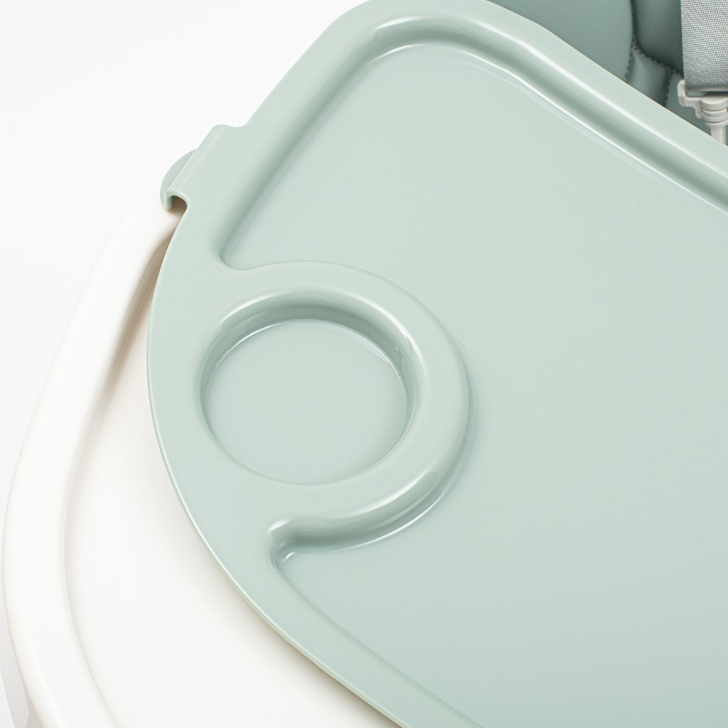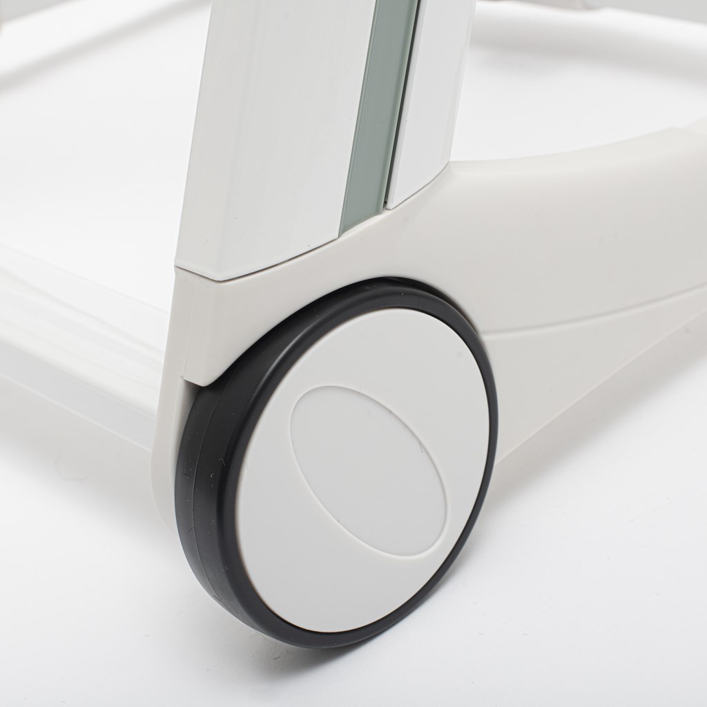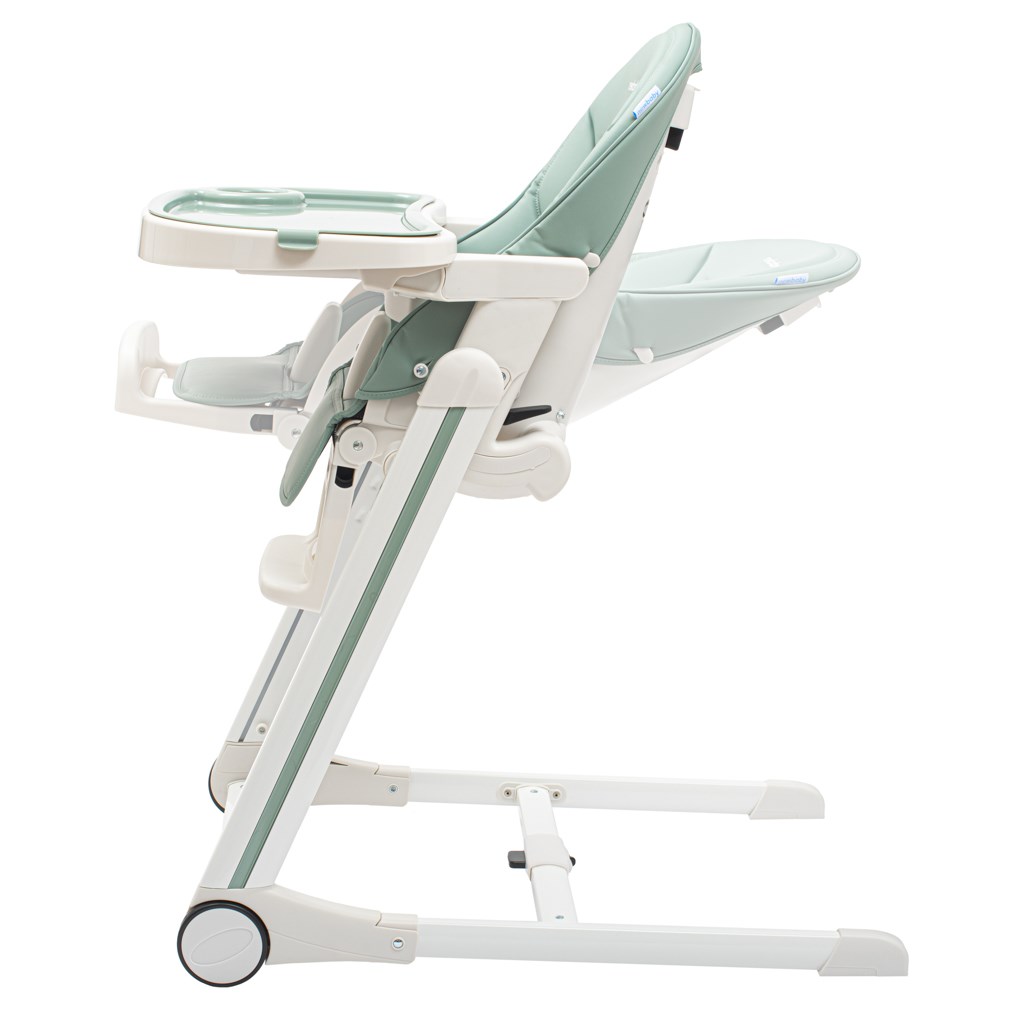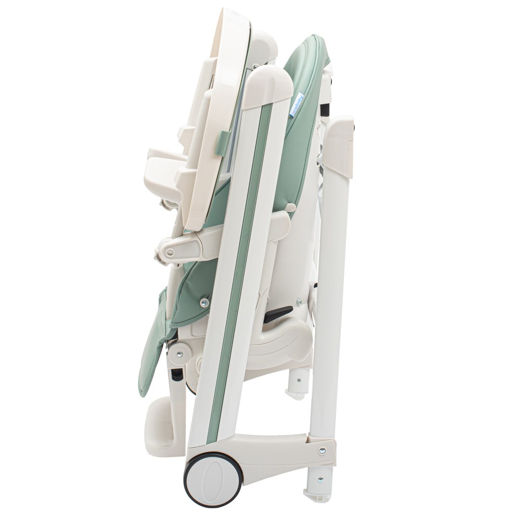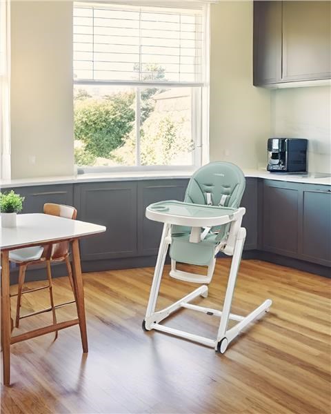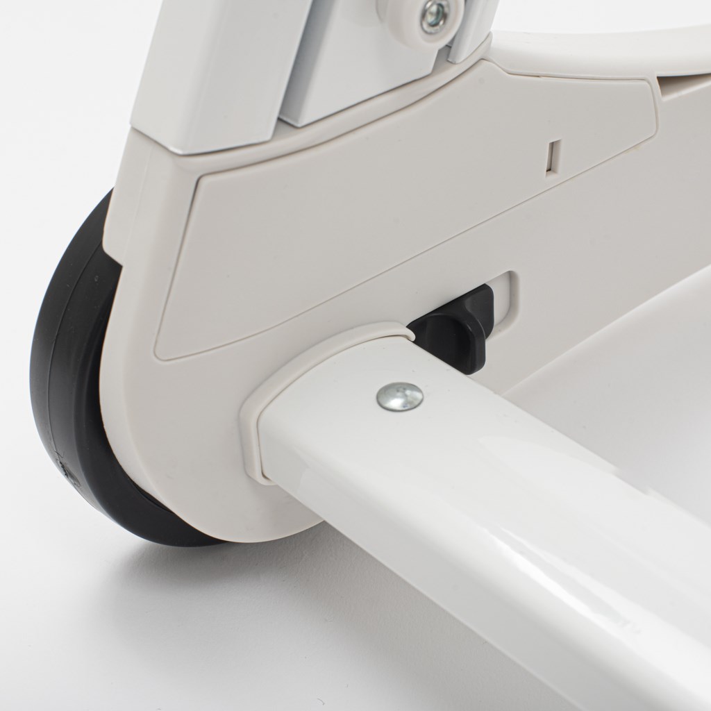 -Scaunul de masă este echipat cu două roţi cu frână şi două picioare de cauciuc.