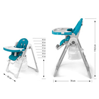 Tapiteria scaunului este fabricată din piele ecologică şi are o pernă moale suplimentară pentru cei mai mici. Pentru siguranţa copilului, este echipat cu centuri de siguranţă ajustabile cu 5 puncte şi cu un suport suplimentar împotriva alunecării. Pe partea din spate a spătarului există un suport pentru a atârna tava. Atât spătarul cât şi suportul de picioare pot fi înclinate pentru a sta culcat. şezutul poate fi ridicat sau coborât în 7 trepte iar picioarele au roţi de cauciuc încorporate. întreaga construcţie poate fi pliată cu uşurinţă şi lin.