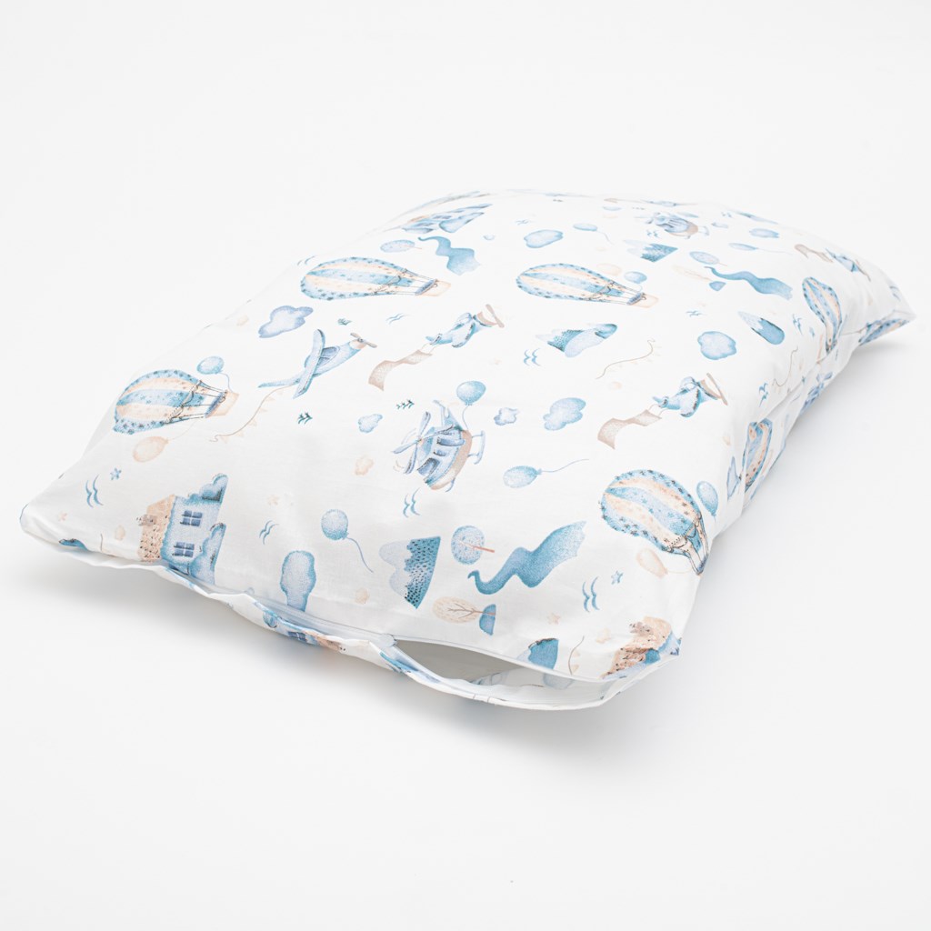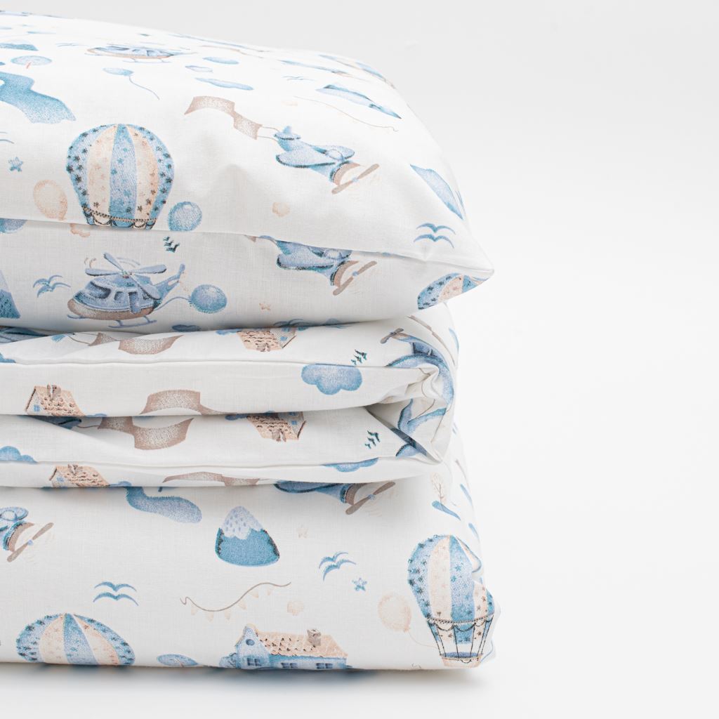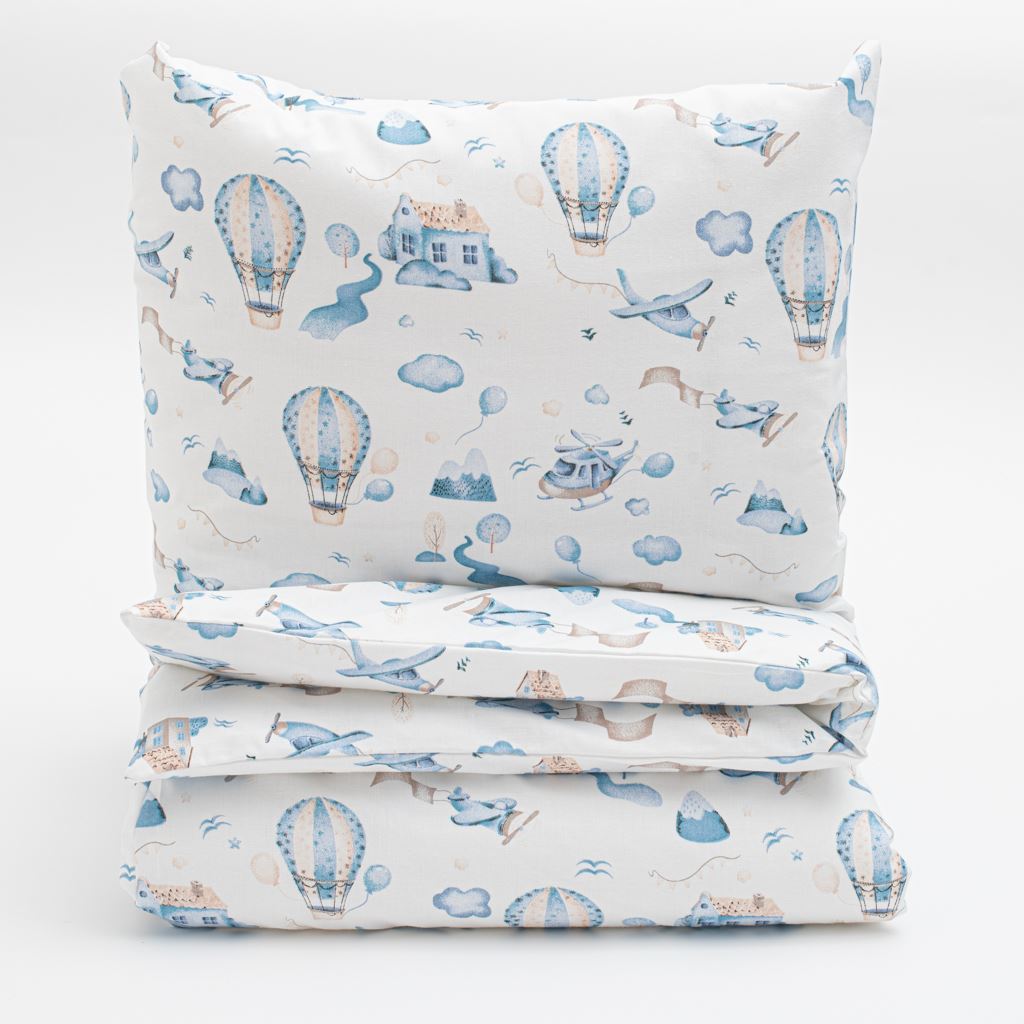 Set minunat de bumbac pentru patut New Baby Romance. Setul include o pernă şi o pătură cu imprimeu de aventură de basm în nori. Totul este umplut cu fibre antialergice. Setul este cusut din bumbac de înaltă calitate. Setul de bumbac va mângâia şi încălzi delicat pielea bebeluşului dumneavoastră. Dimensiuni: pernă: aproximativ 60x40 cm, pătură: aproximativ 90x120 cm. Compoziţie: husă 100% bumbac, umplutură 100% poliester.