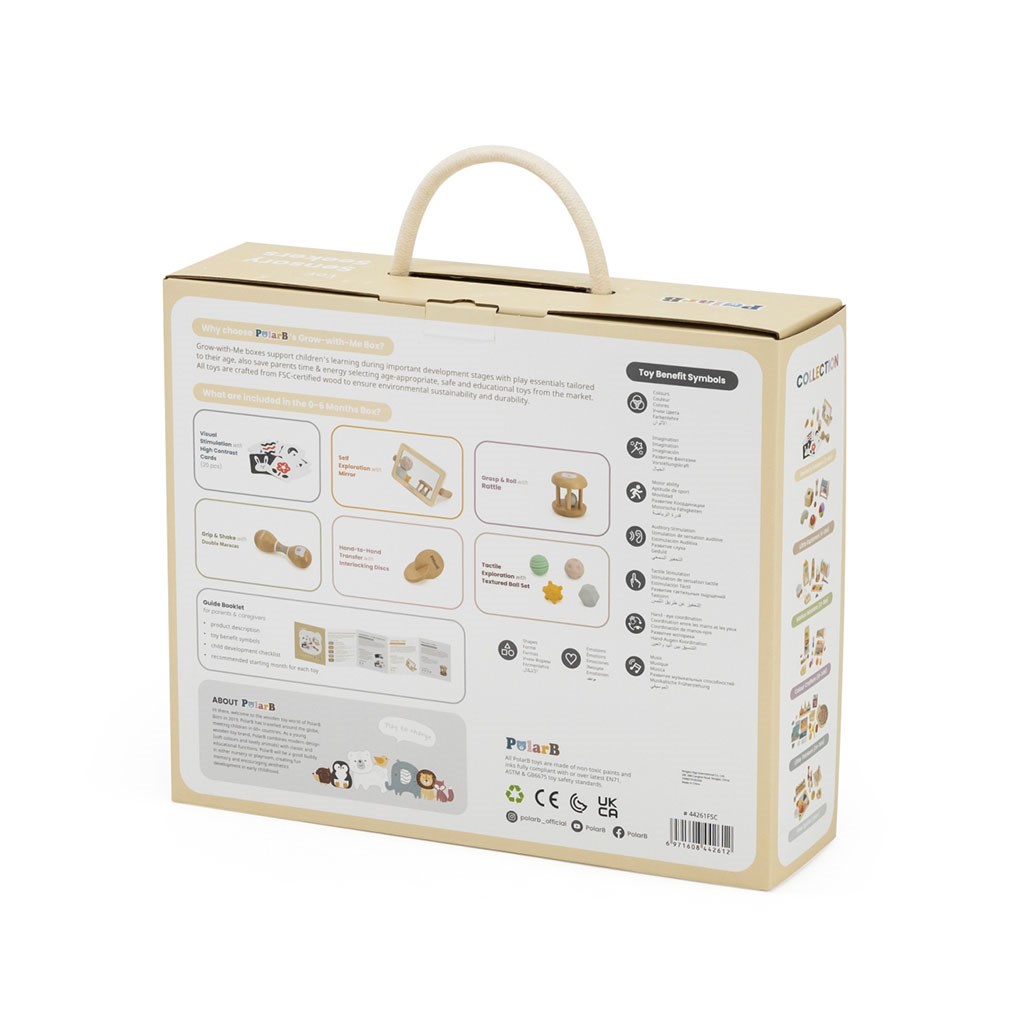 Copiii adoră să se uite la reflexia lor, ceea ce îi ajută să își dezvolte conștiința de sine și să își cunoască corpul. Încurajează-ți copilul să observe fața și gesturile sale în oglindă, ceea ce sprijină dezvoltarea cognitivă și sentimentul de identitate. Cardurile cu modele alb-negru și colorate sunt ideale pentru stimularea vizuală a nou-născuților și sugari. Arată-i copilului cardurile la diverse distanțe pentru a-i ajuta să se concentreze și să recunoască formele și culorile. Setul include diverse jucării senzoriale, care sunt perfecte pentru dezvoltarea motricității fine. Copilul poate să le atingă, să le țină, să le rotească și să le manipuleze, ceea ce îmbunătățește coordonarea între mână și ochi și dezvoltă atingerea. Aceste elemente pot fi folosite pentru distracție, sprijinind dezvoltarea motricității. Rularea mingii sau zornăitul cu zornăitoarea ajută copilul să își dezvolte abilitățile de control și sprijină interacțiunea cu mediul. Elementele care emit sunete (de exemplu, zornăitoarele sau alte instrumente) stimulează auzul și îi învață pe copii despre relațiile cauză-efect – când agită jucăria, auzi un sunet. Este o modalitate excelentă de a învăța concentrarea și de a descoperi lumea sunetelor. Jucăriile cu texturi variate dezvoltă sensibilitatea tactilă a copilului. Încurajează-ți micuțul să exploreze diferite materiale, stimulându-le simțul tactil și învățându-i să distingă suprafețele.