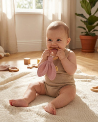 Zgarda cu batista din mușelin este setul ideal când bebelușului îi ies dinții. Zgarda este fabricată din lemn de fag prietenos cu mediul și dintr-un material moale din mușelin. Complet sigur pentru copii, aduce o ușurare liniștitoare în timpul erupției dentare. Zgarda poate fi folosită și ca jucărie pentru bebeluși. Zgarda se potrivește perfect cu celelalte produse noastre din mușelin, creând astfel un set frumos, ideal pentru a fi cadou la o petrecere pentru copii.